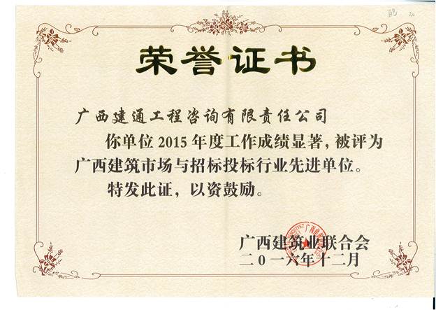 二〇一七年一月六日,广西建筑业联合会建筑市场与招标投标研究分会2016年年会暨表彰大会在南宁市凤凰大厦隆重举行,我集团旗下子公司广西建通工程咨询有限责任公司作为理事会员单位及2015年度广西建筑市场与招标投标行业先进单位获得者受邀参加了此次会议,我集团副总裁谢乃鹏出席了本次会议并作为获奖单位代表接受了表彰和荣誉。